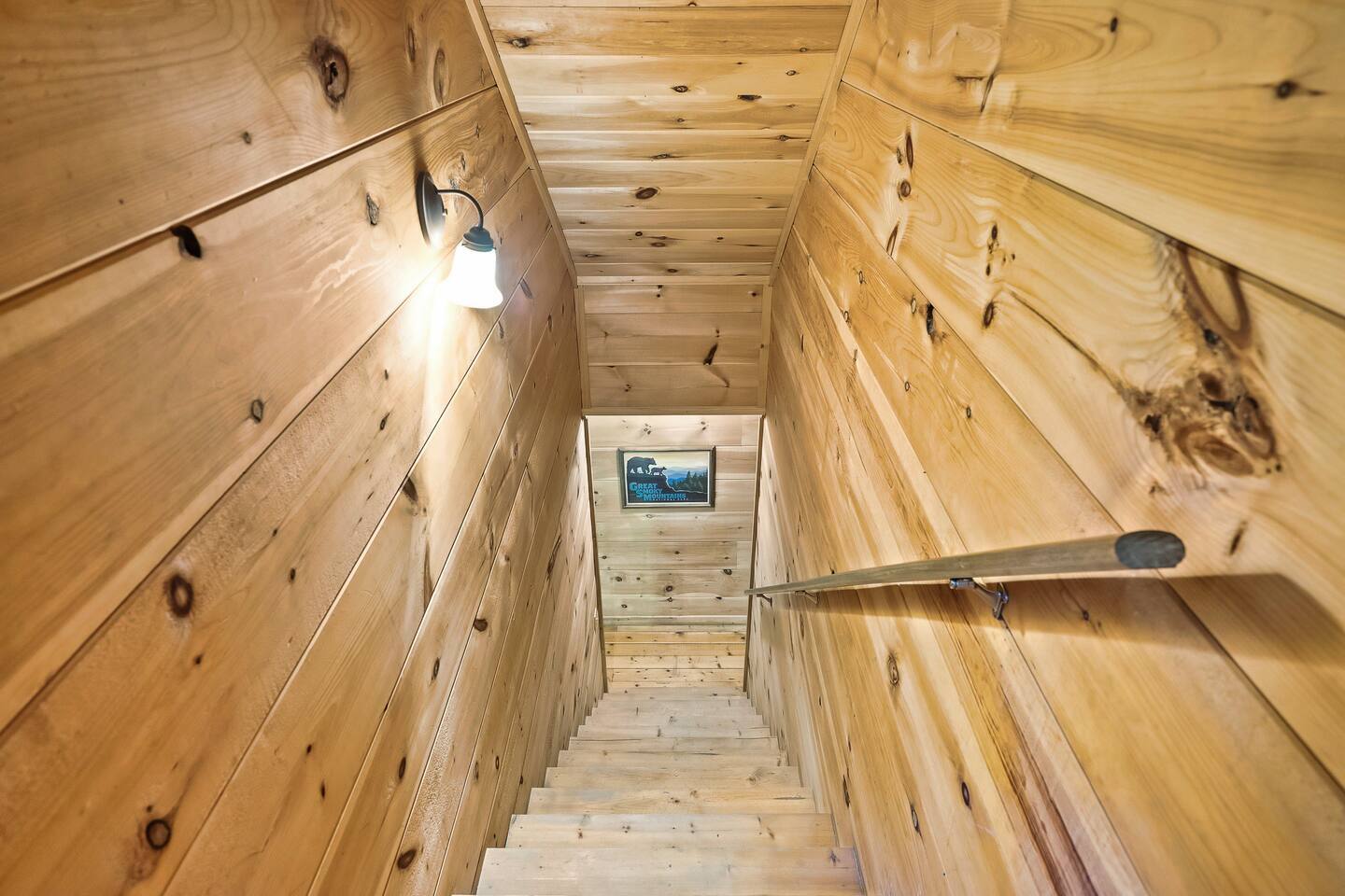 This open-concept cabin living area boasts cozy leather couches, a rustic wooden staircase, and a fully equipped kitchen with black appliances, all set within a warm, wood-paneled interior.