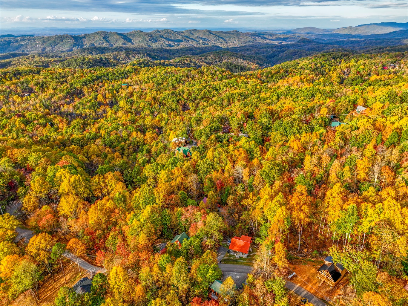 Surrounded by fall foliage, this cabin boasts multiple decks with scenic views. Rocking chairs, a hot tub, and plenty of outdoor seating create a peaceful haven in the forest.