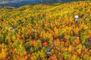 A breathtaking aerial view of a vibrant autumn forest, with golden, orange, and red hues blanketing the hills. Cozy cabins peek through the trees, and distant mountain peaks complete the stunning scene.