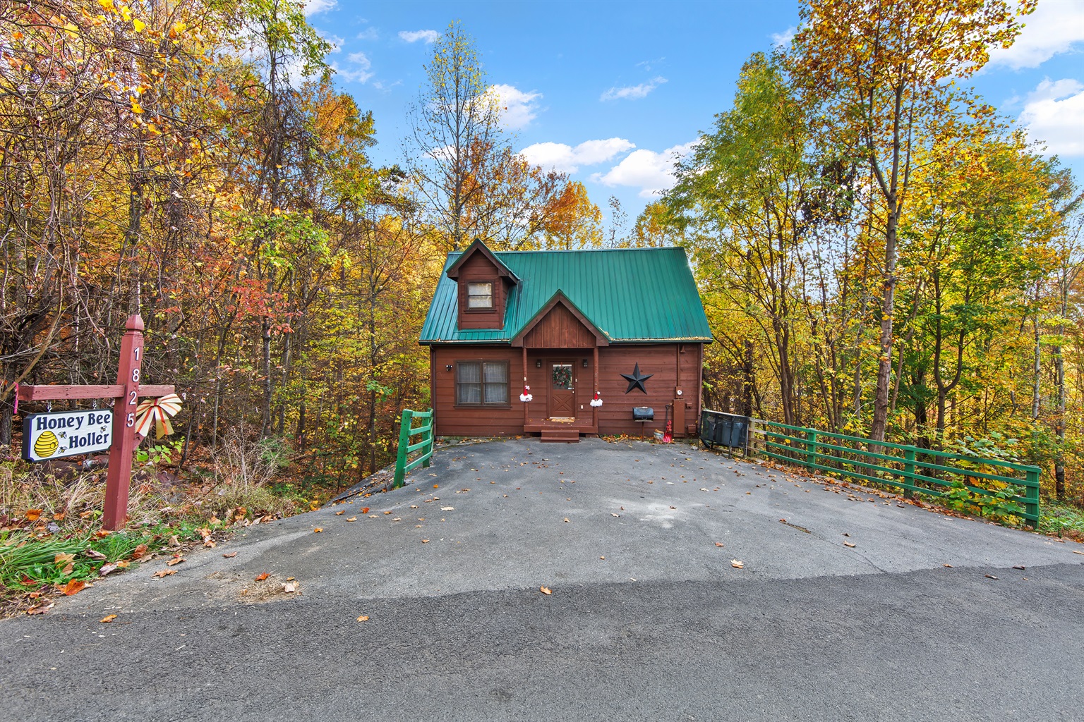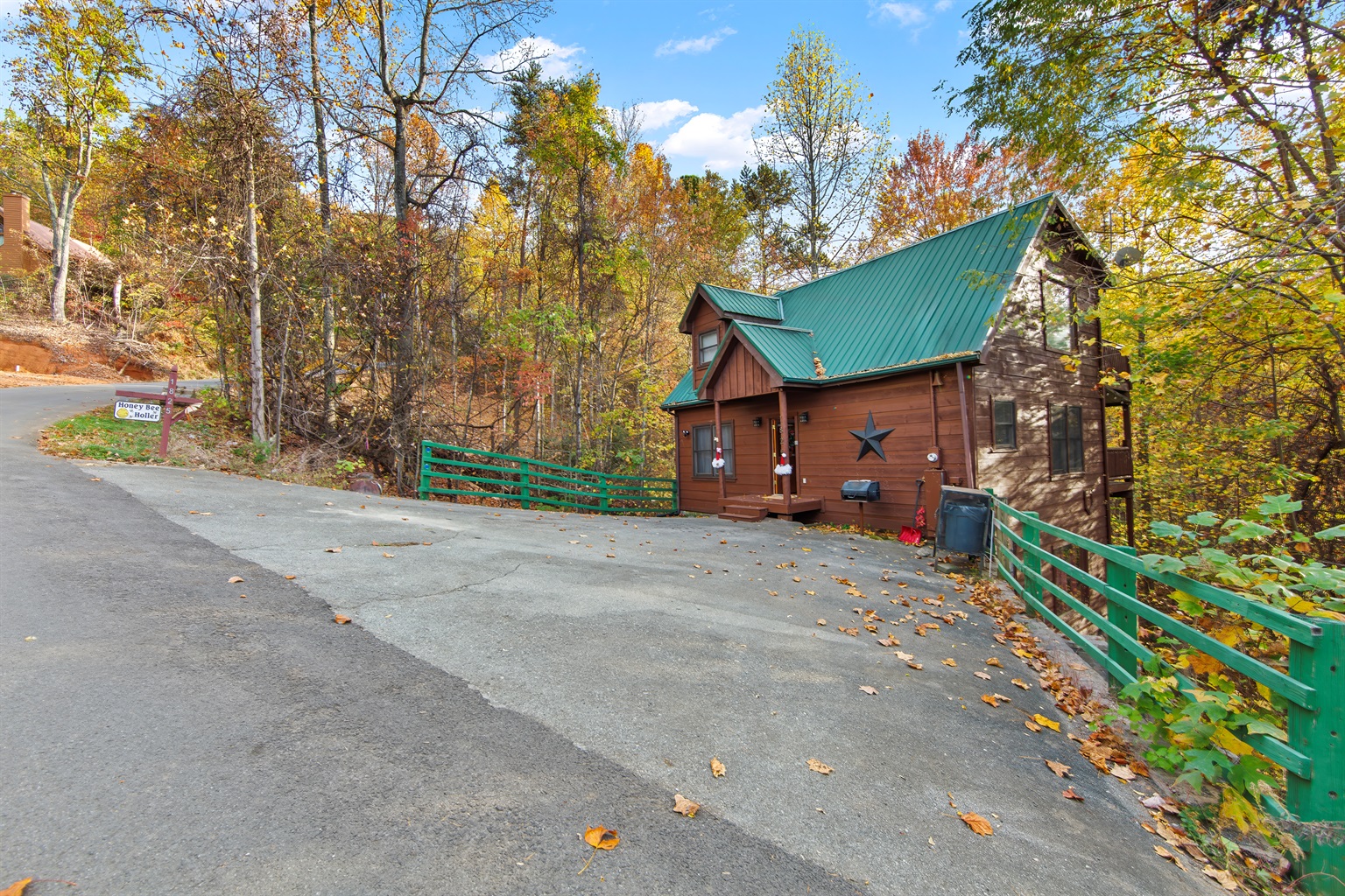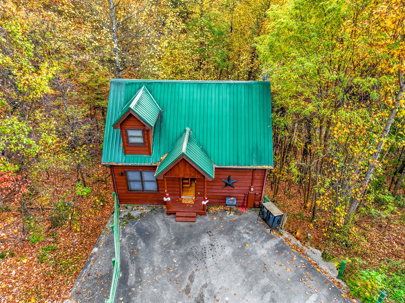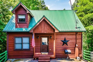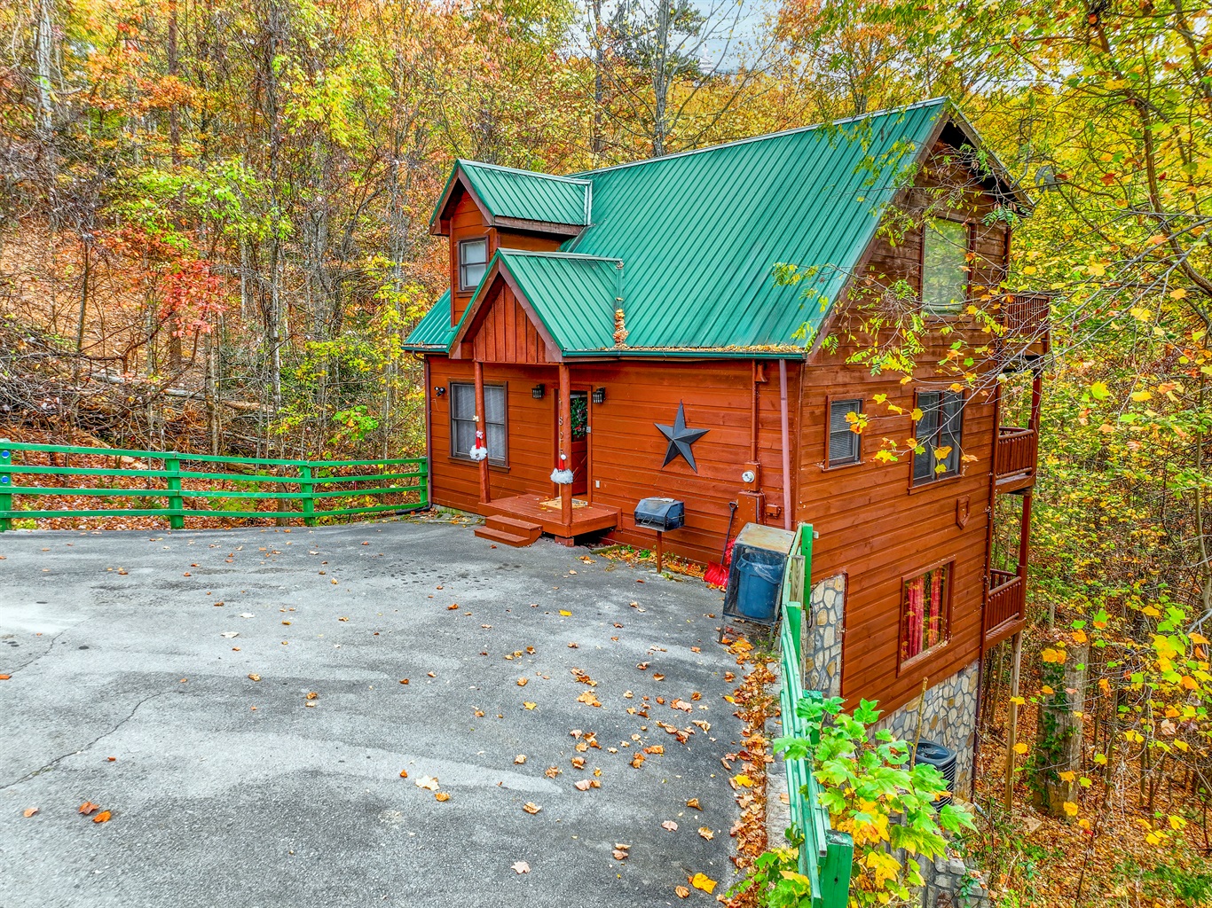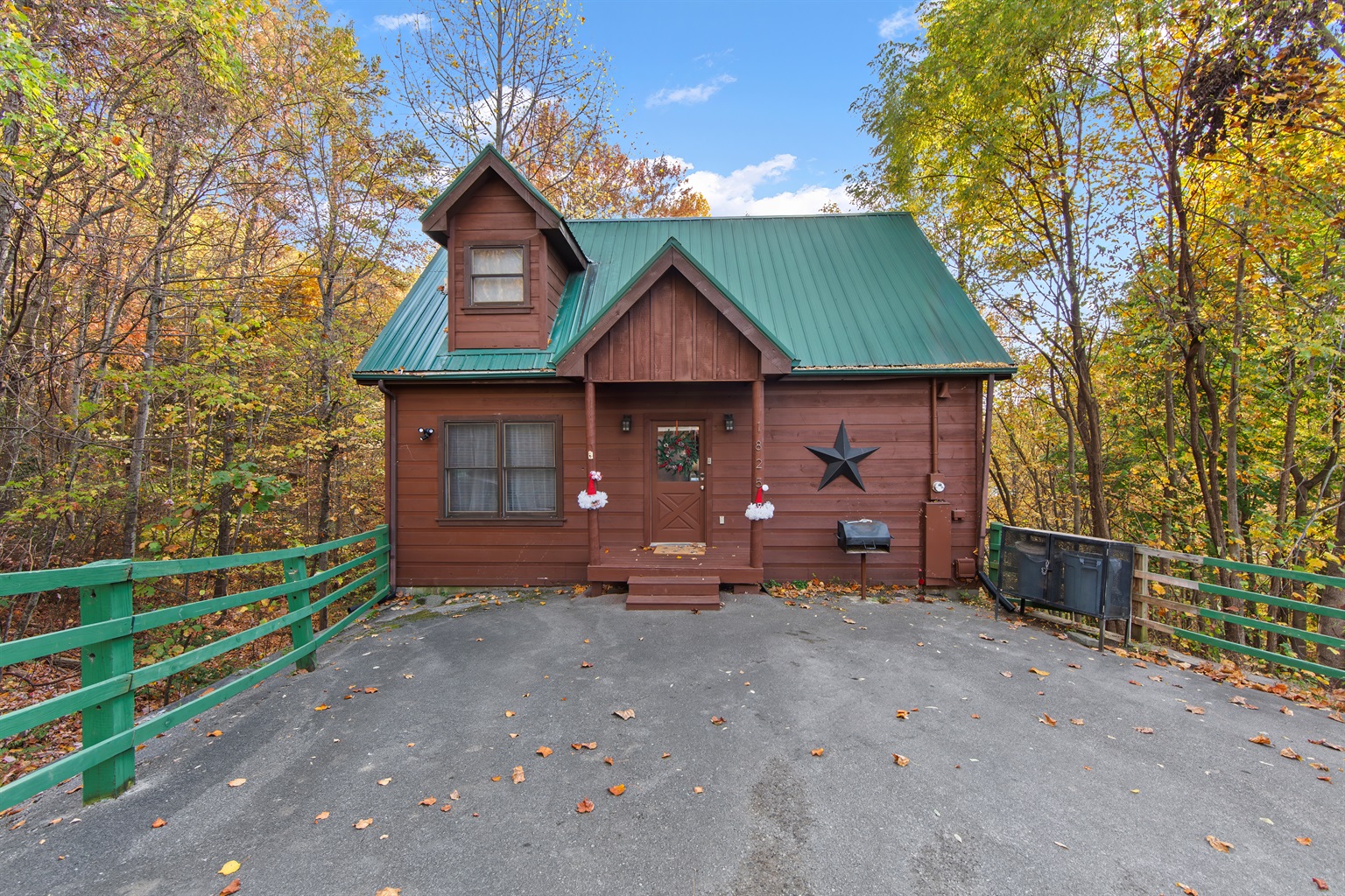 This inviting cabin showcases a green roof and warm wood tones, enhanced by soft porch lighting and a star accent, nestled among the natural beauty of the forest.