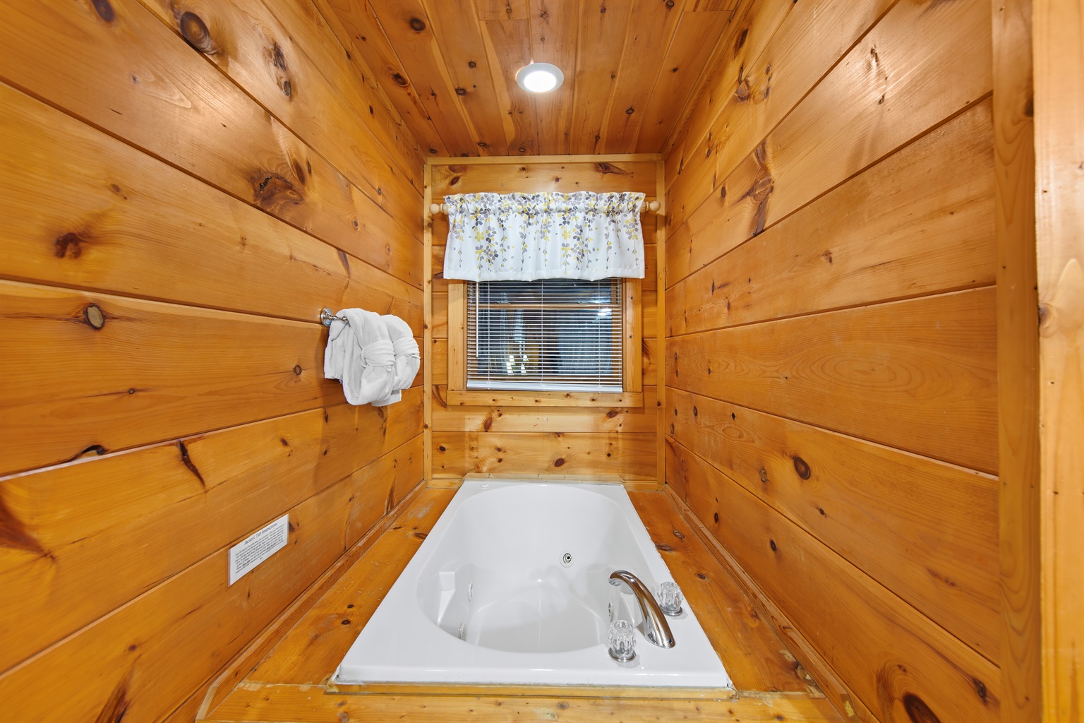 A luxurious jetted tub nestled within warm wood-paneled walls is perfectly positioned beneath a window, offering a peaceful soak with views of lush greenery outside.