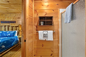 A tranquil cabin bedroom with a spacious log bed, vibrant blue bedding, and wood-paneled walls. The adjacent jetted tub adds a touch of luxury to this rustic haven.