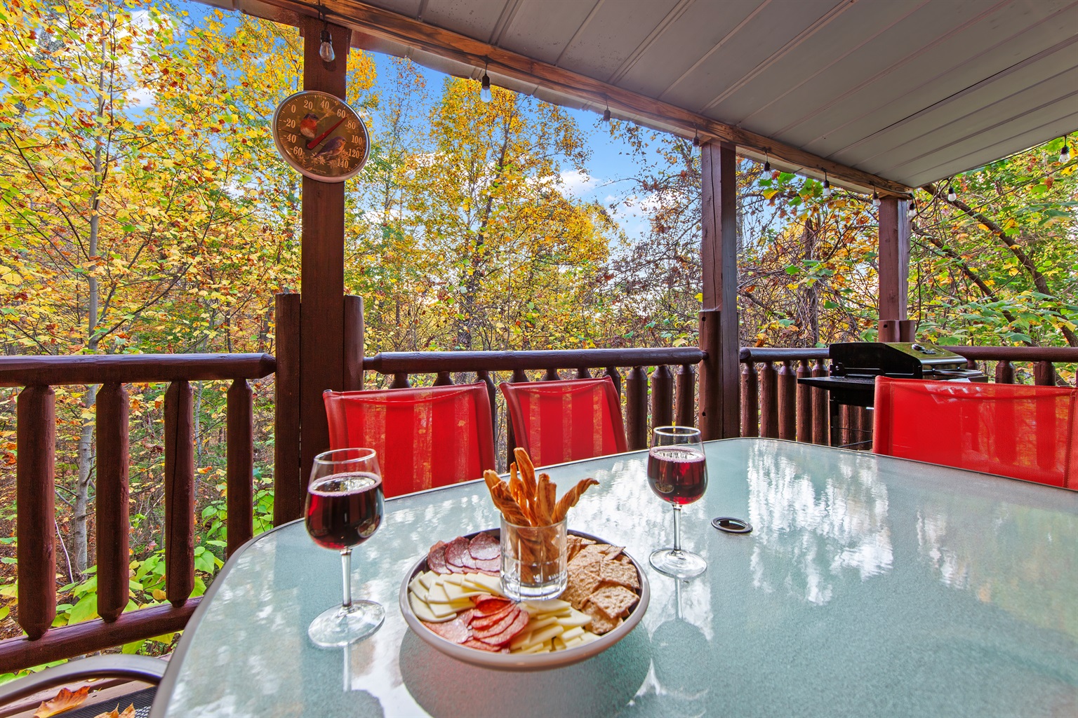 A delightful deck with a glass dining table, vibrant red chairs, and a grill under a covered roof offers a comfortable and scenic spot to dine or unwind in the heart of nature.