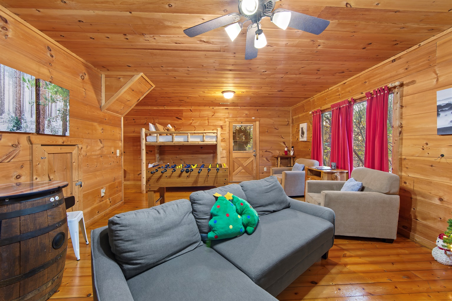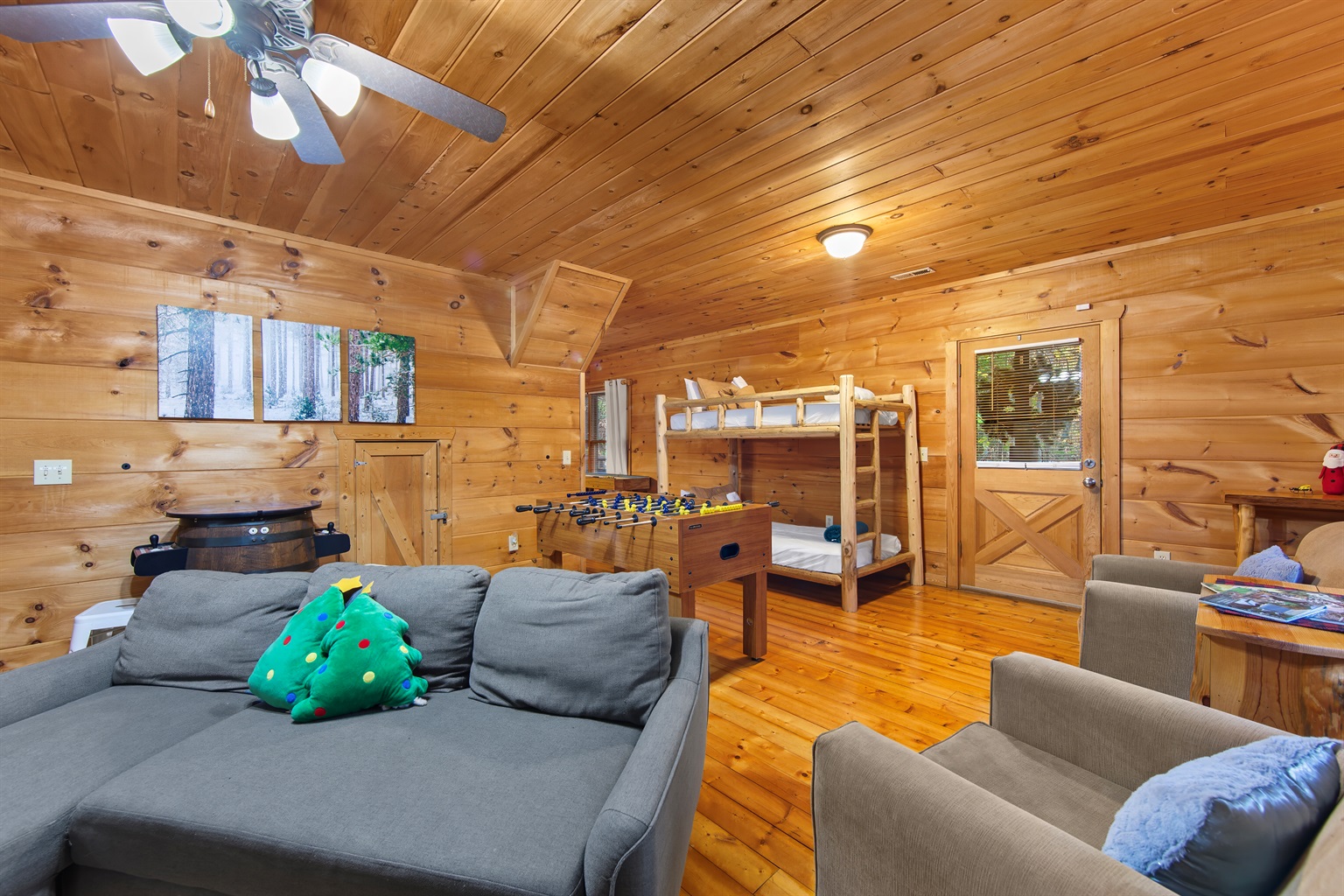 This inviting recreation room features a sectional sofa, a foosball table, and bunk beds, perfect for entertaining or relaxing. Warm wood tones and holiday accents create a cozy, welcoming vibe.