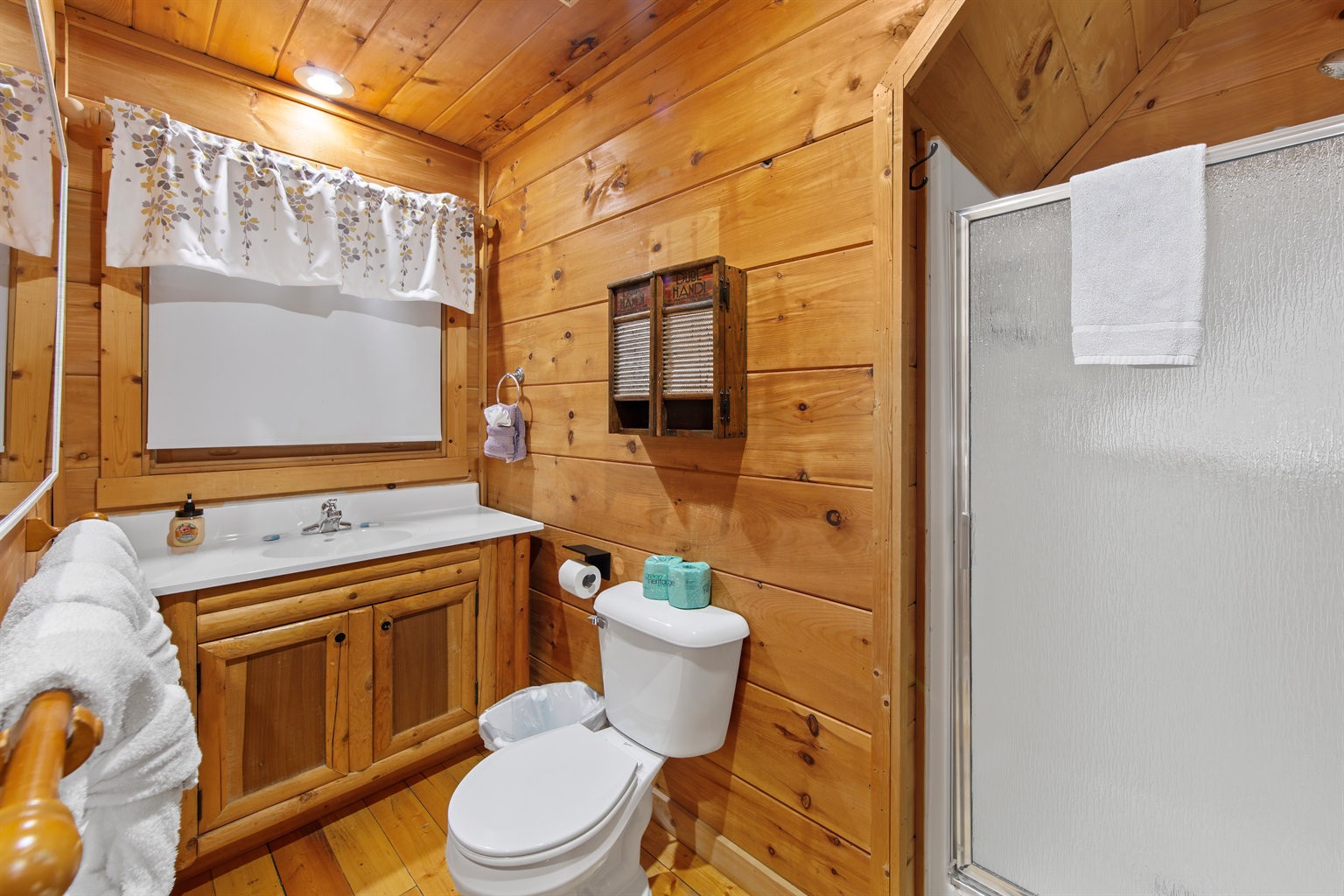 A compact and inviting bathroom setup with a white pedestal sink, rustic wood-paneled walls, and a mirror that blends functionality with the warm aesthetics of a cabin retreat.